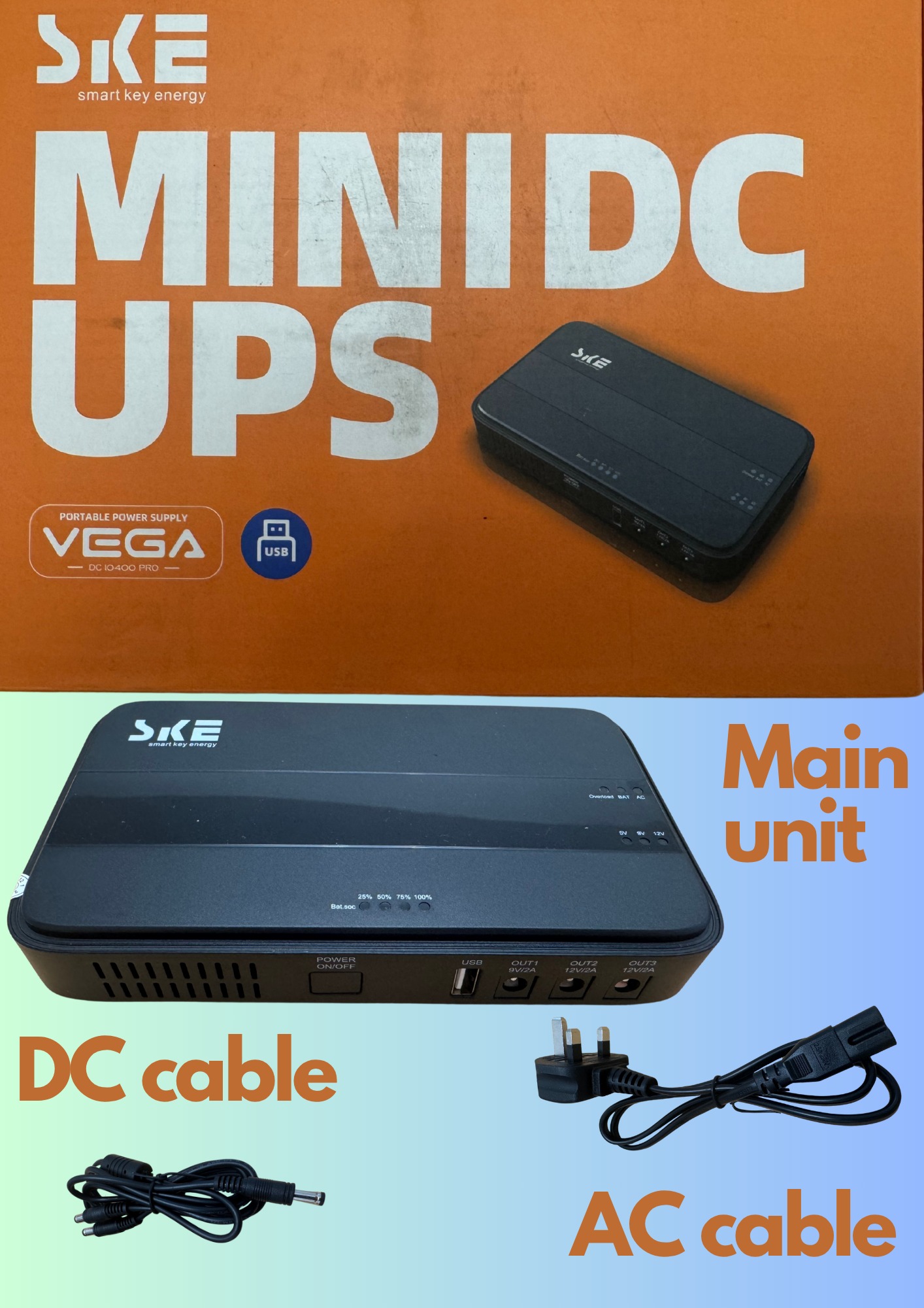 SKE Mini UPS (10400mAh battery, 2x12v outputs, 1x9v output, 1x5v USB-A output)